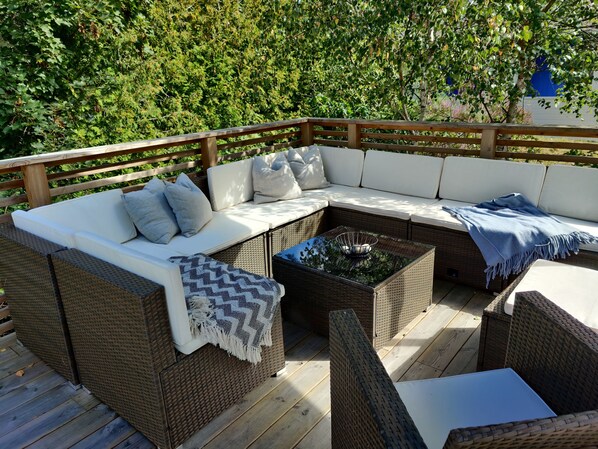 Cozy house with large wooden deck near the sea and the beach