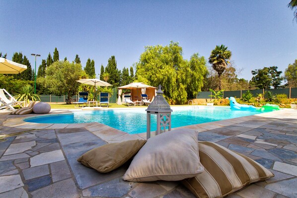 The garden, with the splendid swimming pool shaded by pine trees, is equipped with gazebos and umbrellas and measures 12m X 6m - with depths ranging from 1.10m to 2.20m.