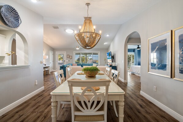 Located on a corner lot in a quiet neighborhood, Coconut Cove is surrounded by mature palms, a lush green lawn, and plenty of open space. In the main living area, brand new furnishings, wood floors, and vaulted ceilings create an open, airy space to kick back in front of the large flatscreen. The formal dining room sits nearby, with seating for eight.