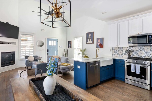 Our other standard amenities really put life in a cramped, cookie-cutter hotel room to shame: you'll have a full kitchen, laundry, fast WiFi, a smart TV, and total privacy for your stay. Our homes all feature Ring doorbell cameras and custom-coded keyless entries, so you can rest easy knowing your security is top notch. You won't be shelling out big bucks each day to park in a twisty multi-story deck either, as all of our properties have free off- or on-street parking.