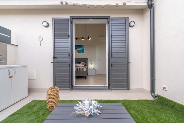 Guests can enjoy a private terrace at the entrance and a backyard for moments of relaxation.