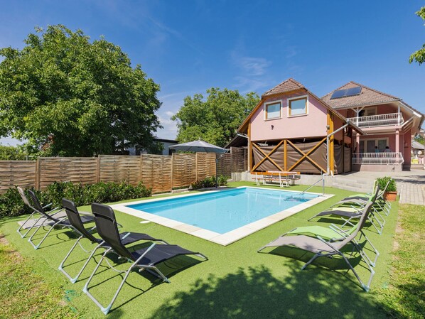 Balatonszemes: Cosy apartment house "Zsuzsi", 2 storeys, renovated in 2011. In the resort, 1 km from the lake. Private: garden 800 m2 (fenced), swimming pool (7 x 4 m, depth 135 cm, seasonal availability: 15.May. - 15.Sep.). In the house: WiFi, washing machine. Grocery 400 m, restaurant, grass beach 1 km. Riding stable 400 m.