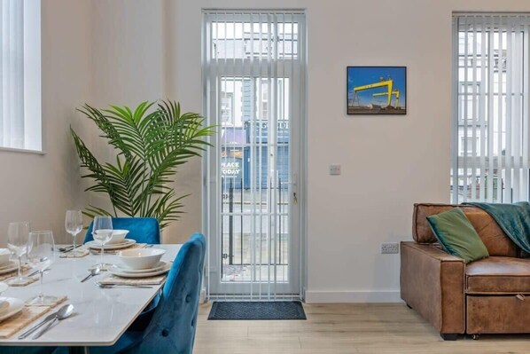 Bright, spacious 2-bedroom apartment in Belfast’s contemporary East Village—finished to a high standard and set up for up to 6 guests with an optional sofa bed. Enjoy an open-plan living/dining area, fully equipped kitchen, Smart TV, and high-speed broadband, plus free on-street parking outside.
