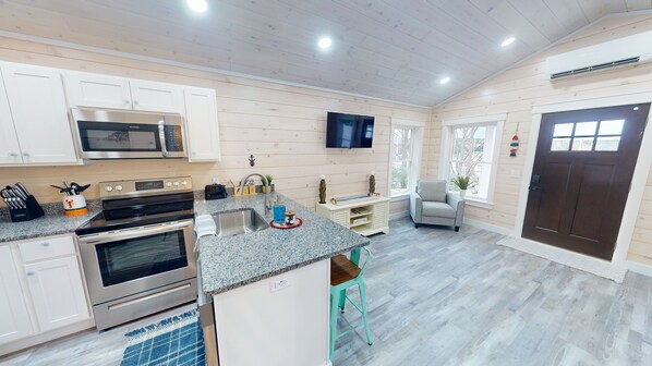 The driveway for Harbor View Cottage is located on the left side of the duplex. The main entrance is around to the front of the unit and can be accessed with a smart lock on the front door. Once inside guests are greeted by an open concept living room and kitchen. The kitchen is equipped with everything guests need to create meals during their stay.