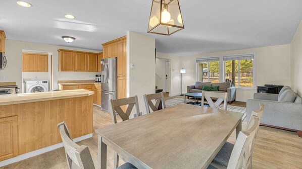 With an open, welcoming layout, Gadwall is ideal for family gatherings or group getaways. The dining area comfortably seats six, while the back patio offers additional seating and a BBQ grill for outdoor meals. A slider door provides easy access to the patio, and bikes are included for guests to explore the miles of paved Sunriver pathways.