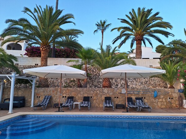The villa is accessible via stairs and is entirely single-storey, offering three comfortable bedrooms with built-in wardrobes and two bathrooms. Two of the bedrooms have direct access to the pool terrace. The living room is tastefully furnished and features air conditioning (cooling and heating), satellite TV with European channels, and a fully equipped kitchen. Free high-speed fibre-optic internet is available throughout the house. Parking in the street in front of the house is free.
