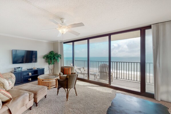 Overlook the surf and sand from the wrap-around balcony of this 10th-floor, three-bedroom oceanfront corner condo - one of Sea Colony's largest beach community floor plans! Just steps from Sea Colony's half-mile of private beach and oceanfront pools, this single-level resort escape features a living and dining area, and a well-equipped kitchen. Enjoy central air conditioning, a washer/dryer, accessibility without stairs, three TVs (including a 51-inch flatscreen in the living room and a 31-inch flatscreen in the primary bedroom), three DVD players, and free WiFi.