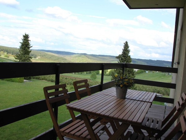 The apartment features a cozy living room with a wood-burning stove, a well-equipped kitchen, and a sunny balcony. Guests can enjoy a spacious, partially fenced landscaped garden (shared with other guests), complete with a barbecue area, sandpit, play equipment, and a table tennis table for fun-filled afternoons. The setup is particularly child-friendly and ideal for unwinding in nature.