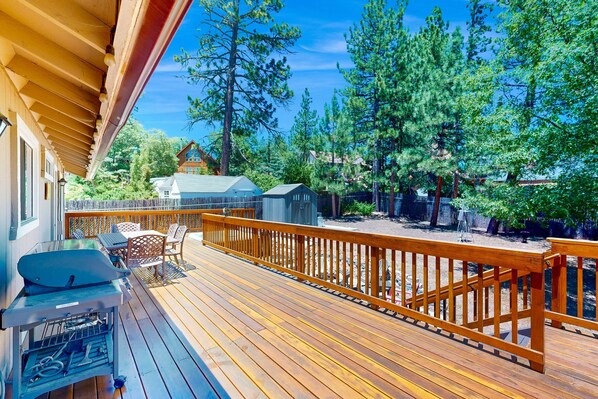 Take your pick between a gas and charcoal grill and throw a cookout on the large new deck. While dinner sizzles, relax in two chairs shaded by a large umbrella. Share meals at the four-person table. As evening falls, soak in the private hot tub or gather around the fire pit. Solar lights illuminate the deck, patio, and hot tub. Additional outdoor space includes a front porch with seating for five and a gate that can be completely closed off. A basketball hoop hangs above the driveway. In the garage you'll find a provided basketball as well as a ping-pong table and a card table for two.