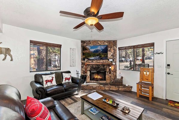 Cozy 2BR cabin just 2 mins from Snow Summit! Sleeps 4 with full kitchen, dining area, fast Wi-Fi, fireplace, and free parking. Relax on your private porch after a day on the slopes. We’re known for fast, friendly support—local host always nearby! Need more space?