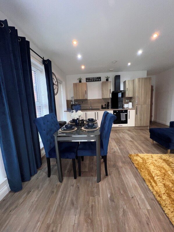 Our kitchen features modern appliances and ample storage space. Whether you're wanting to cook or prefer quick meals, our kitchen caters to all your needs. There will be also some basic cleaning supplies and bin bags to get you started.