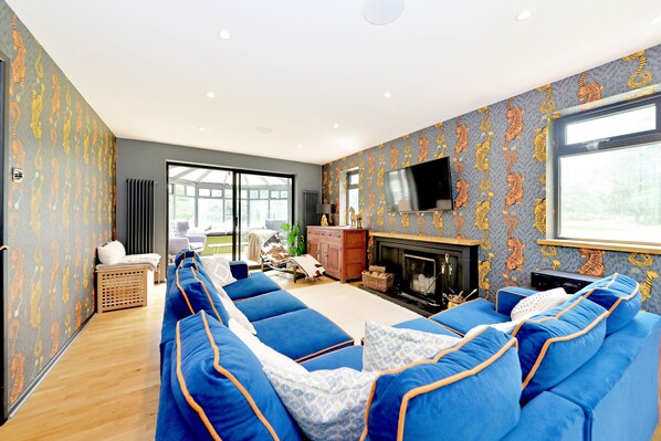To the right of the entrance lies the sitting room, boasting oak-effect flooring and adorned with statement wallpaper that elegantly complements the royal blue sofa. The room's focal point is the sleek black surround fireplace, promising cosy evenings during colder nights. Through the patio doors, the sitting room flows seamlessly into the conservatory, offering panoramic views of the captivating gardens.