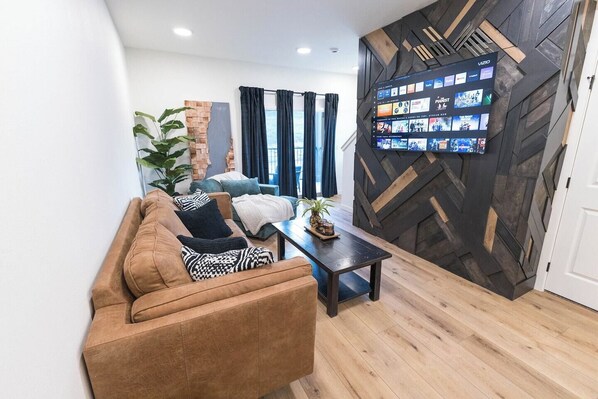 AMENITIES: • Off-street parking for 1 in Parkin spots + One parking spot in driveway + One in the Garage. • Smart TV with surround sound (lower level living room) & Both king rooms have 55 inc TV • 5G high speed internet. • Fully equipped kitchen with all necessary cooking utensils (pots/pans, flatware, dinnerware etc.) • Quality linens & (duvets, sheets, towels, etc.) • Auto Drip pot and Keurig single ( 2 coffee makers) • Fire Pit and Heater on Balcony • Washer and dryer • BBQ on first level • Hair dryer(s) • Clothes iron & ironing board • Alexa music 3 total - Living room and bedrooms • Sound Machines all rooms