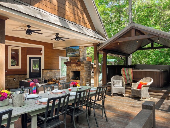 Let’s be honest, this is what you came to Broken Bow for. You’ll be spending as much time as possible on the huge deck enjoying every second of your time here. Soothe and soak under the magic of fairy lights in the hot tub, watch the game together under the stars, or gather around the campfire to make s’mores and memories that will last forever. Or challenge your favorite rival to a game of cornhole, tetherball, or carpetball while the kiddos play together in the giant wooden teepee and outdoor playset.