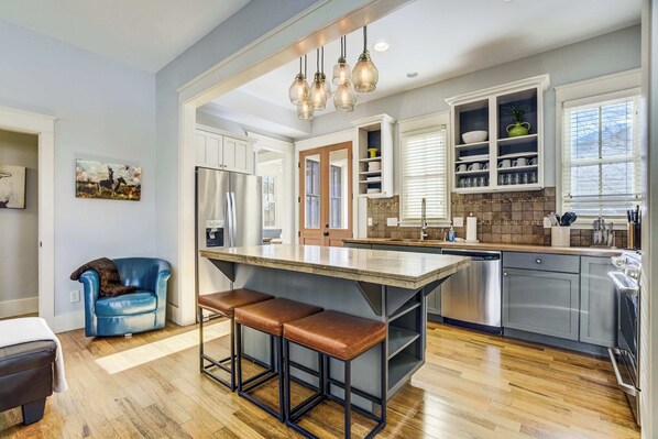 The kitchen connects seamlessly with the living space, featuring stainless steel appliances, generous counter space, and everything needed for easy, home-style cooking. A coffee maker with complimentary coffee and a curated spice rack are included for your convenience. Just beyond, a built-in breakfast nook filled with natural light offers a warm spot for morning coffee or casual meals. The dining table nearby brings everyone together comfortably for shared dinners and conversation that carry late into the evening.