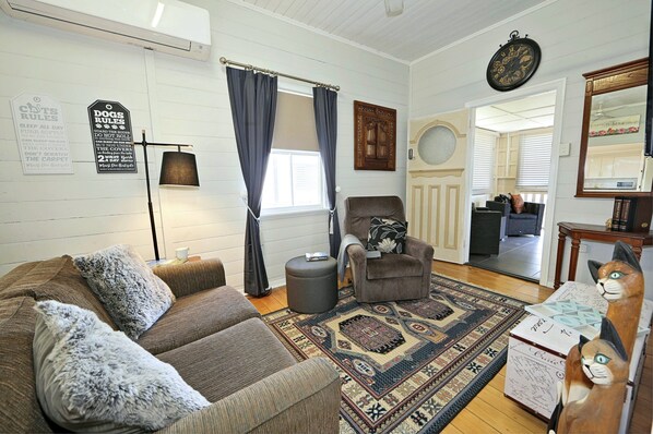 Older cottage with nice new bathrooms and kitchen. Compact living area lovely rear deck.
