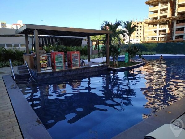 Este apartamento em Caldas Novas tem piscina interna e piscina externa.
