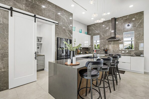 Sophisticated and serene home on waterway, sparkling pool, fireplace, W/D & AC