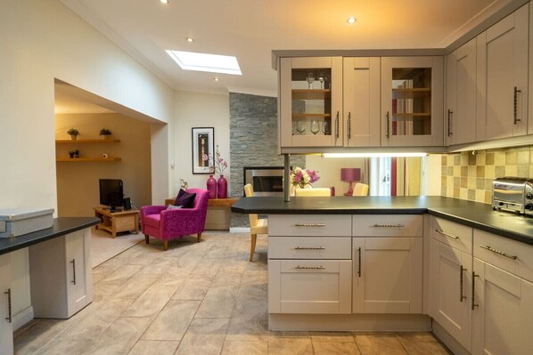 The living space is modern and open, with a comfortable lounge leading towards the dining area and a sizeable kitchen. A corridor housing the stairwell to the upstairs runs alongside these spaces so that they can be closed off from noise if required. The lounge area is calm and restful, with two double sofas and an armchair facing towards the TV stand and HDTV. Lamps and reading lights make this space both cosy and social. Just beyond, the modern, floating electric fireplace sits alongside the dining table and chairs. This space is deceptive, as the breakfast bar leads right through to a large kitchen area. There are also patio doors leading to the garden from this lovely space.