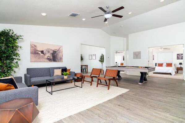 Step into the inviting open-concept living area, a stylish space designed for bringing everyone together. Enjoy hours of entertainment watching movies, playing pool, or creating culinary masterpieces in the fully equipped kitchen.
