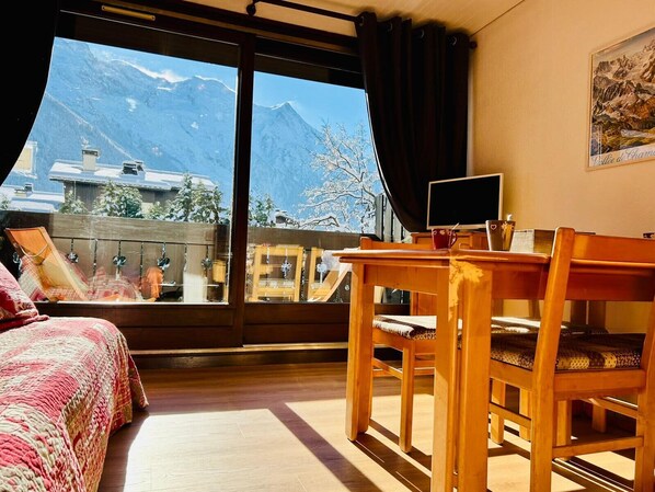 The living room opens onto a balcony offering breathtaking views of Mont Blanc and the Aiguille du Midi, allowing you to savor every moment of your stay.