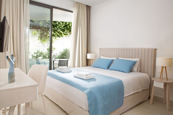 One master bedroom with 180cm bed and en-suite bathroom with hydro message tub. Large window doors open to private balcony with sea views. One large bedroom with twin beds –convertible into a king– and en-suite bathroom with private balcony.