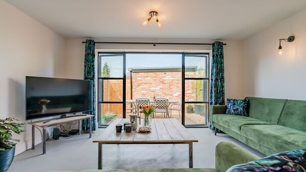 Finishing this room, the sitting area has two three-seater sofas which can be converted into beds for added flexibility with the sleeping arrangements. These soft velvet sofas contrast with the rougher textures of the steel and brick. There is a smart TV which includes access to Virgin Media and a large coffee table. French doors from here open to the terrace.