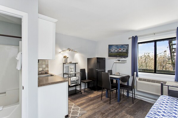 Adorned in Crisp White and Nautical Navy, there's nothing ordinary about this adorable and affordable Condo. On one side you'll find a beautifully updated Kitchenette that even has an Air Fryer/Convection Oven Combo - perfect for a quick bit before hitting the Beach! With both a Mini Fridge and an Apartment Size Refrigerator, there's plenty of room for all your food and beverages. Enjoy morning coffee and watch the News on the Flat Screen Cable TV. The Daybed on this side has 2 Twin Beds (Twin with Twin Trundle), that also serves as a comfy sofa.
