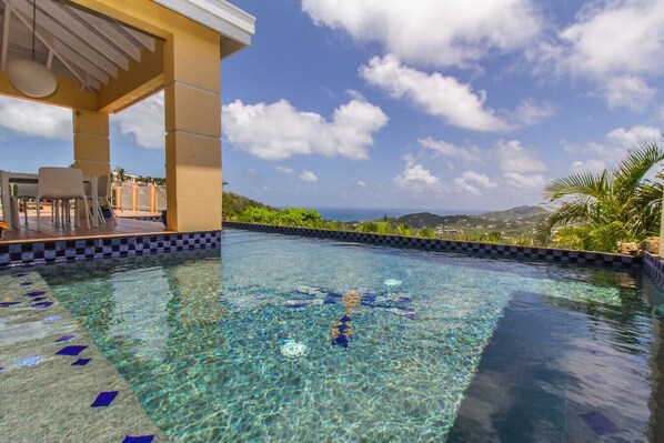 • The pool is an infinity pool with a view of the ocean and the hills on the East end of St. Croix. It therefore has a low boundary wall that can be dangerous for children or adults who do not use the pool with caution.