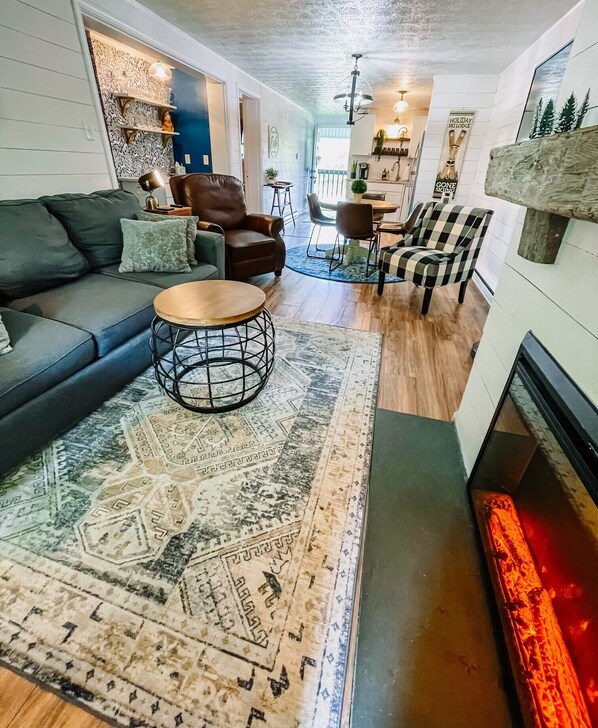 Queen size sleeper sofa in living room which makes sleeping 6 easy!