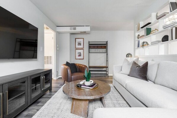 ◆ The living room boasts a large wall-mounted SMART TV and plenty of comfortable sofa seating for enjoying relaxing downtime together. The sofa also opens to a queen-sized bed for flexible sleep space.