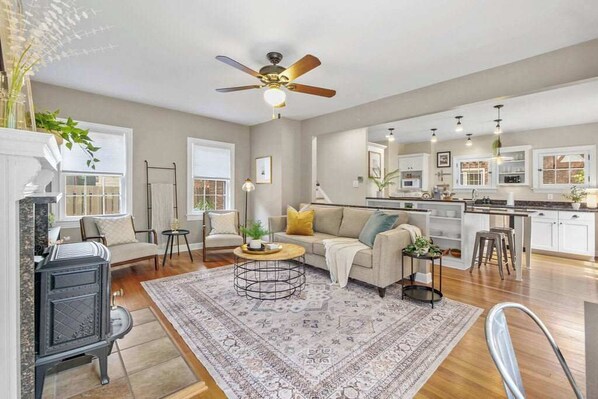 As you walk into the home from the front door, you'll be enveloped in a sea of natural light coming from the windows of the kitchen, living room and breakfast nook area (seating for 4). There is a half bath off of the fully-equipped kitchen with bar seating for 2, as well as the door leading to the basement where the washer and dryer are located.