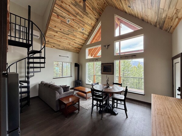 This is one of two mirror-image secluded cabins in the woods offering beautiful scenic views and miles of mountains to explore. We call them Sunrise and Sunset because of the spectacular views you'll experience from these two locations. They feature an open floor plan with access to the kitchen, bathroom, and private bedroom from the main floor. The spiral staircase leads to a loft with a queen bed and futon couch that unfolds into a bed. The staircase railing has wide openings, so we don't recommend these cabins for young children. Please ensure your children can easily climb stairs and won't have an issue with the wide openings in the staircase.