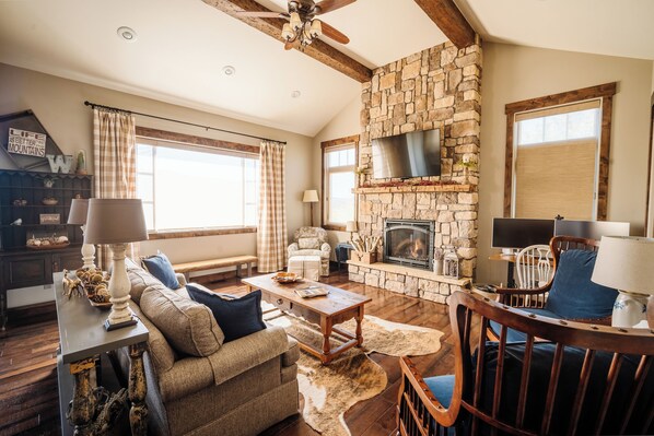 The heart of the home is the fully stocked kitchen, complete with plenty of dishware, spices, and essential kitchen basics, along with options for both coffee and tea. The spacious island bar serves as a social hub, inviting conversation as the chef brings dinner to life. The kitchen seamlessly flows into a large dining room, perfect for family gatherings and entertaining. The cozy living room, adorned with plenty of comfortable seating and a beautiful fireplace, invites relaxation and connection, making it the perfect space to unwind after a day of adventure. The living room has an additional workspace with a standup desk, dual monitors, and a chair available for all your remote work needs. This home combines functionality with comfort, creating an ideal sanctuary for modern living.