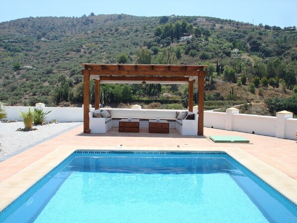 The lounge opens directly onto the pergola covered dining area. The terrace also includes an outdoor kitchen with a brick built BBQ. Adjacent to the private swimming pool there is a cosy gazebo where you can relax in the shade. The garden is terraced and has a selection of Mediterranean plants and palms.