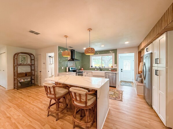 The inviting living space features a plush oversized sectional and a large Roku TV for all your streaming needs. The gorgeous mid-century modern meets beach bungalow kitchen is fully stocked for cooking and includes a wine and coffee bar, drink fridge, and a Keurig with complimentary coffee. The oversized kitchen window overlooks the front yard, where gatherings happen and kids play. A washer and dryer are also available for your convenience.