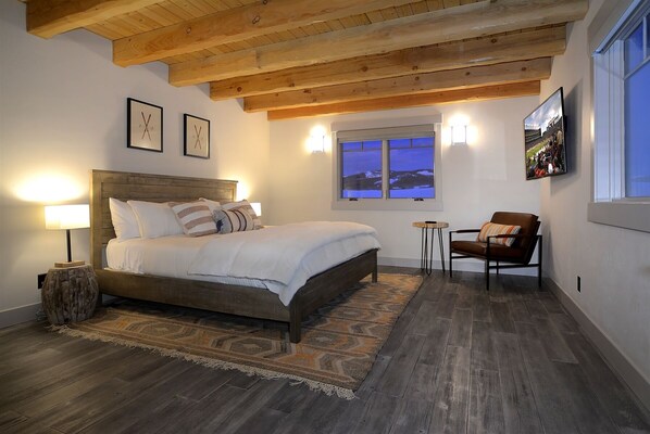 The master bedroom has a king bed, flat panel tv, and picture windows to take in the views. Don't worry, when it's time to sleep the Hunter Douglas room darkening shades in each of the bedrooms insure that you can sleep in if you want too. After all, you are on vacation! The master bath is oversized and comes with dual vanities, soaking tub, steam shower, and a walk in closet. Don't worry about cold tile floors because the whole house has radiant in floor heat for those chilly mornings.