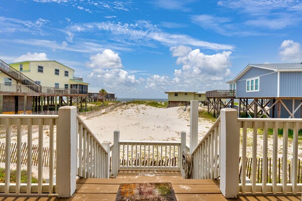 Enjoy a Getaway and Play vacation with great views of the Gulf Beach and easy beach access. Getaway and Play is an attractive home with wood flooring in the living areas and comfortable carpeted bedrooms, 3 cable TVs, DVD player, full size washer/dryer, and free Wi-Fi. Enjoy the large fully equipped kitchen with dishwasher, microwave, ice maker, toaster, coffee maker and more. Getaway and Play has wonderful, large open and covered decks, perfect for enjoying the view, relaxing in the island breeze or sunbathing.