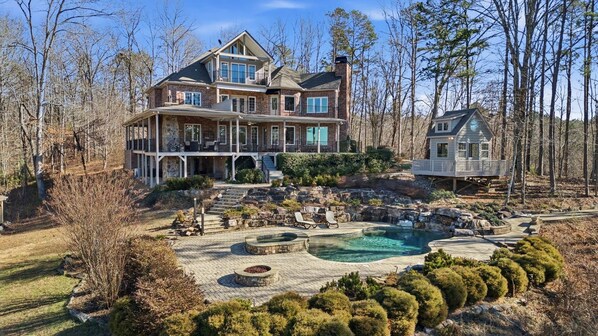 From the kitchen, you have access to the expansive deck and wrap around porch with seating for everyone to enjoy. There is a gas-start wood-burning fireplace on the deck, a luxury pool with waterfall, hot tub, and gas fire pit for guests to enjoy outside.