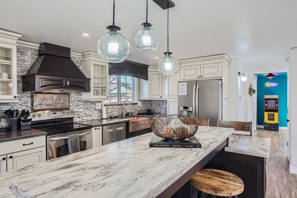 ⋑ Embrace the vintage charm of our kitchen, complete with a kitchen island and seating for 4.