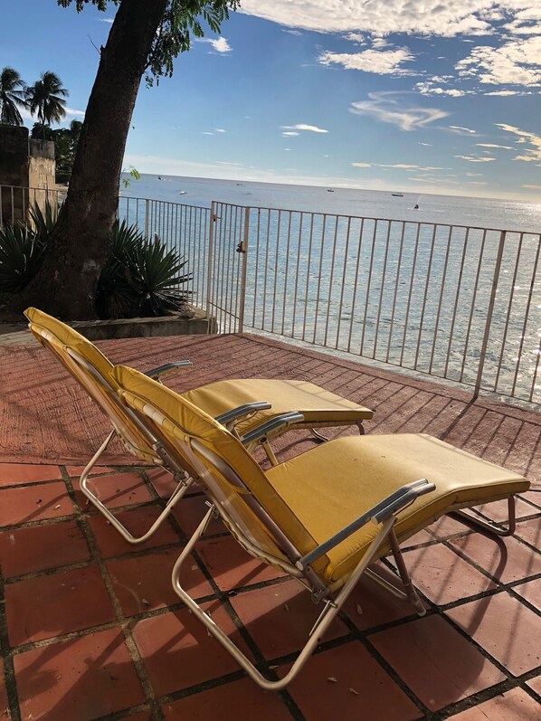 Step out of the patio door, down some steps and onto the beach and the massive swimming pool called the sea. Beautiful view with palm trees. Very well presented apartment. On the road to Bridgetown and Holetown. Plenty of buses throughout the day. Location ideal away from Hussle and bussle. Supermarket 5 mins walk. Wendy's Sports Bar 3 mins walk. Michael and Grantly look after the running of the place and a phone call away if help needed. Plenty of utensils, glasses, towels. Washing machine with a very fast cycle. TV good entertainment too. Weather warm, sunny/cloudy and a cool sea breeze. Some information of the area and what to do present. Security of property with locks good and good night time lighting. Lovely sound of the sea hitting the shore and top air con and ceiling fans available. Lovely sun sets too virtually every day.Really glad we finally got to visit this piece of Paradise. We would stay here again! Well done and thank you Sally