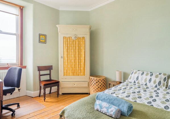 The main bedroom is furnished with a double bed, antique wardrobe, mirror and desk and chair positioned next to the window, which makes an ideal spot to complete a little work if need be.