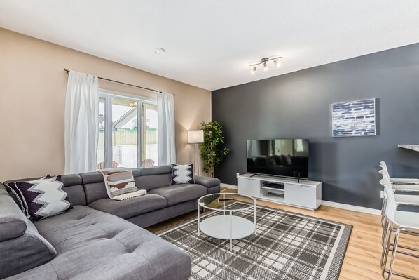 This suite has in-floor heating system which make this place very comfortable to live during the winter. It has a large patio in front of the suite with big picnic table and seats, facing a huge fenced beautiful yard which has kids play facility, those all make your stay more enjoyble in the summer as well.