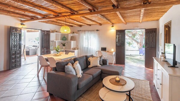 The thick-walled rural house has a double bedroom and another with 2 single beds, both equipped with air conditioning for greater comfort. The spacious living room has a fireplace that provides warmth, creating a cozy atmosphere for any season of the year. The fully equipped independent kitchen has everything you need to prepare delicious meals. It also has a functional and comfortable bathroom with shower.
