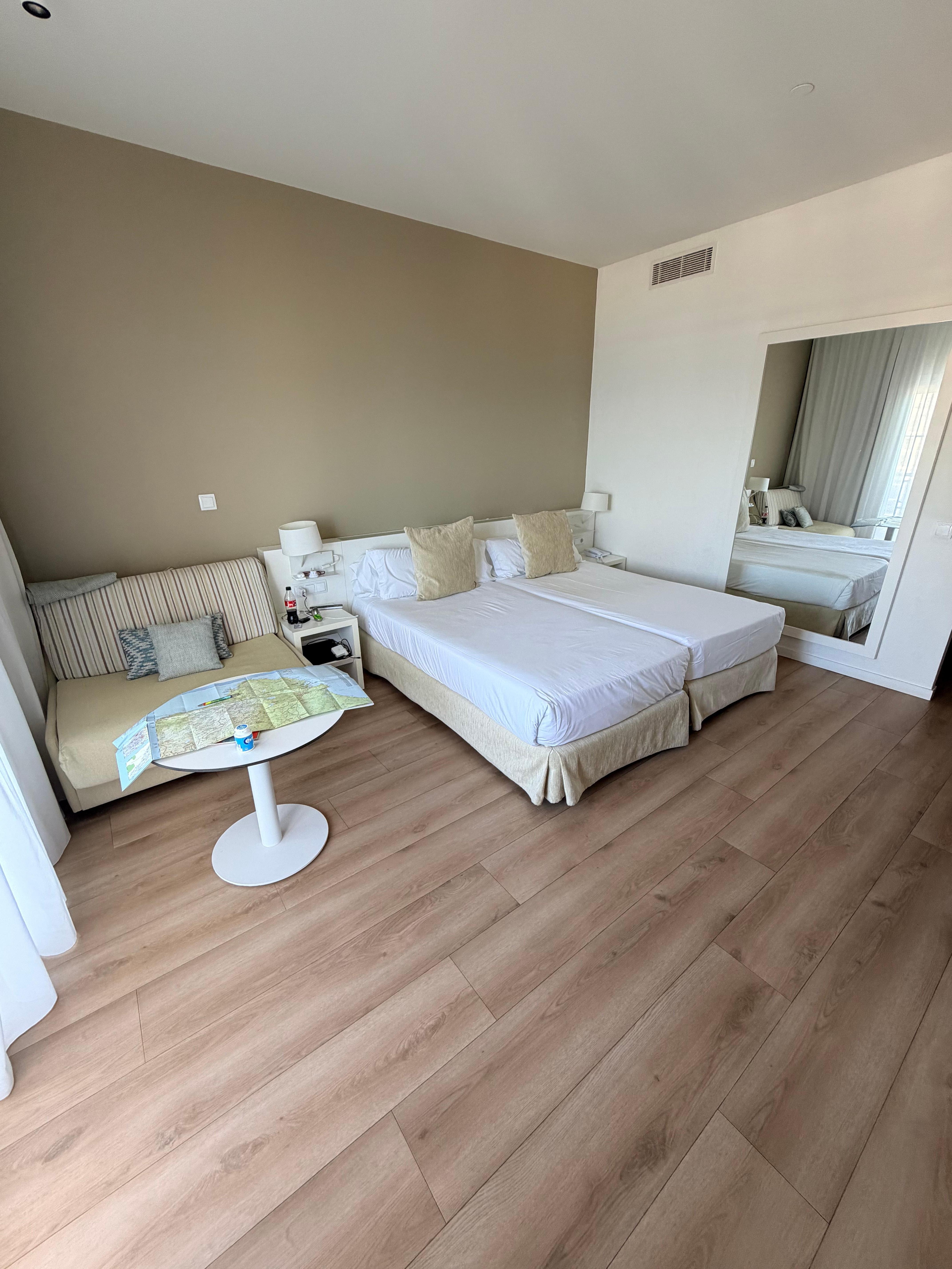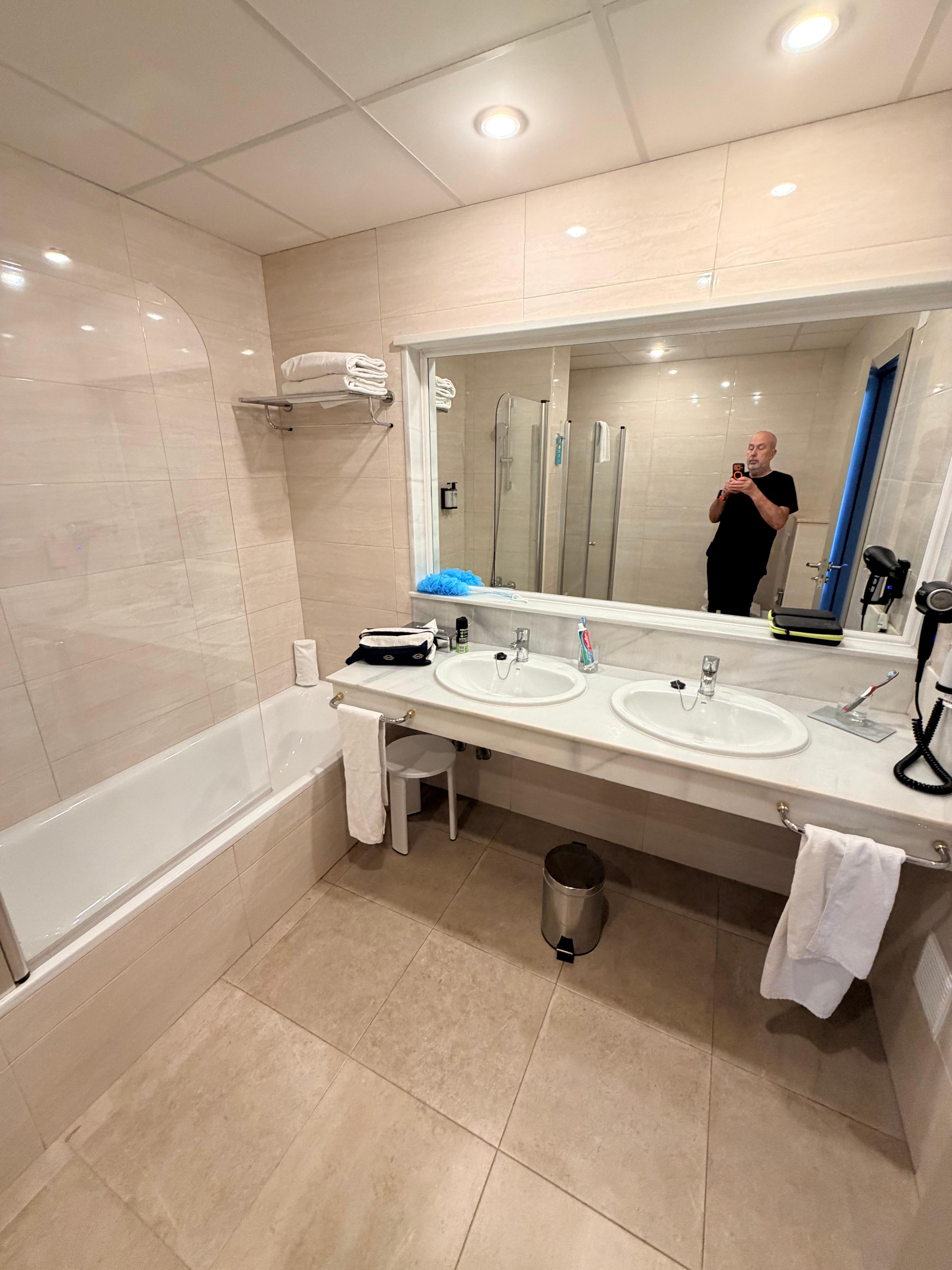 The hotel is a very large one sitting in large grounds. Everything is perfectly maintained, we were early in the season and things were being cleaned, repaired and painted ready for the main season. The staff are all well dressed, friendly and helpful. The room we had on the 6th floor was fantastic and we had a good view of the sea and got every sunset. The cleaning staff were very good at their jobs and I never felt that anything would go missing. Plenty of hot water, good shower, bath too, pair of sinks. We had hired a car at the airport and we had been informed there would be plenty of parking, unfortunately they didnt mention the cost. I think we paid just under £80 for 7 nights parking which I was not happy about. Also upon arrival we were offered an upgrade from half board to all inclusive for the price of £480, we declined and they didnt push it again. The drinks were not cheap, the local beers were not particularly great, we ended up drinking very little all week and was pleased we had not gone all inclusive. The breakfasts were pretty much the same every day, something that vaguely looked like bacon, beans, eggs, mushrooms, etc as well as cereal, toast, meats, cheese, coffee and juices, the main issue we had here was that everything was just warm or cold!! In the end we discovered the microwave and sat near that so we could nuke our food so it was hot. Evening meals were different every night, there was a choice.