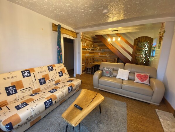 Comfortable sofas, a secluded dining area suitable for family meals or relaxed gatherings