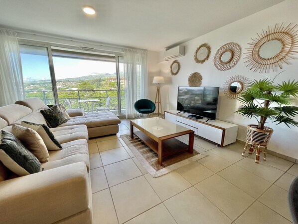 In a recent residence, located at the very entrance of the capital of Tahiti, this spacious two-bedroom apartment is functional and bright ; the ideal seasonal rental for a stay close to the capital Papeete.