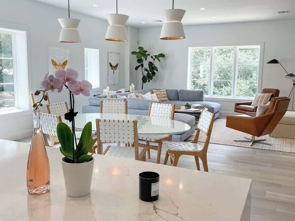 - Open concept w/large glass top dining table for 6