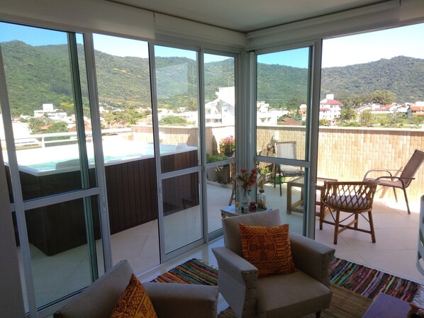 Este apartamento em Florianópolis tem uma piscina interna e uma banheira de hidromassagem.