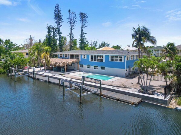 Welcome to your getaway at Santini House, a 7-bedroom, 7-bath duplex conveniently located on South Island on Fort Myers Beach. This spacious duplex offers enjoyable space for family or friends. The backyard living area boasts a large tiki hut to gather under, along with a new saltwater pool featuring a sun shelf and stone paver deck. Enjoy watching the kids swim in the pool while you relax in this amazing backyard—your favorite hangout spot. Whip up a delicious meal in the fully equipped kitchen with plenty of counter space. Downstairs, there's a master king bedroom with an attached walk-in shower bathroom, complete with a washer and dryer. The first guest bedroom has a queen bed and an attached walk-in shower bathroom. The second guest bedroom offers two queen beds with an attached bathroom.
